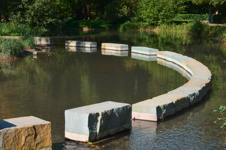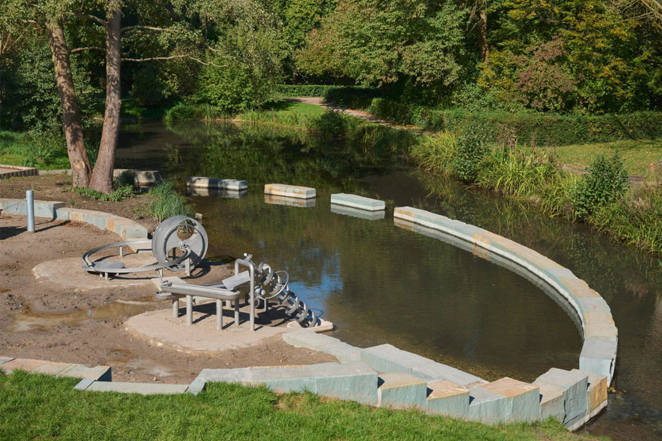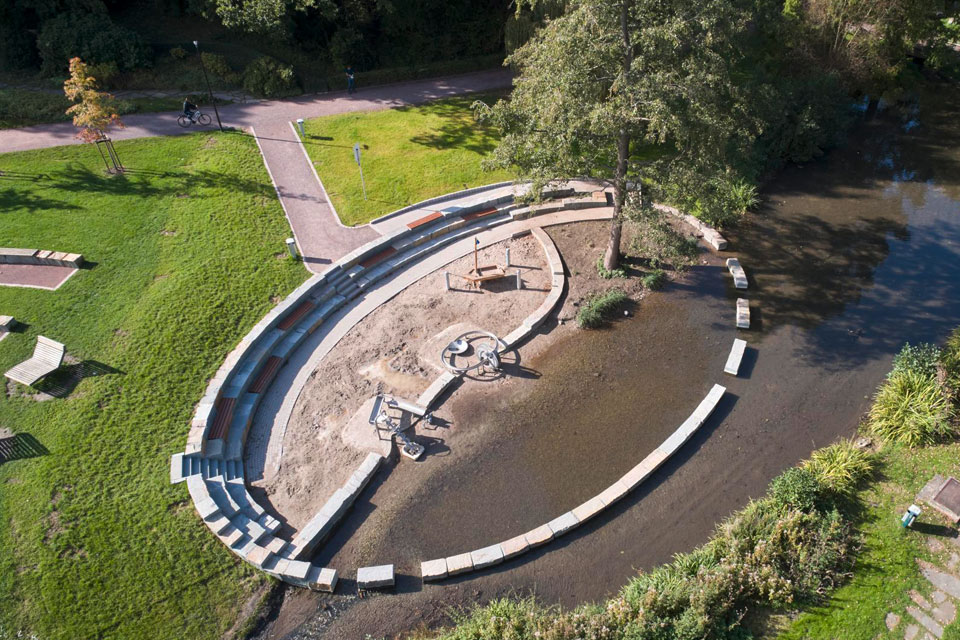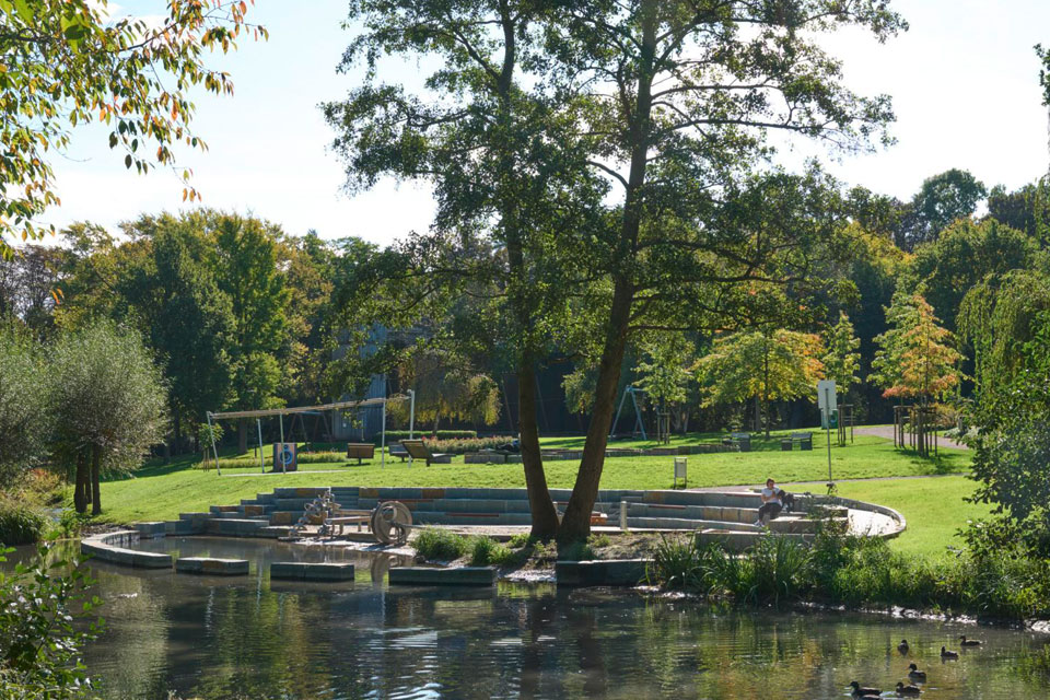 Im Kurpark Werl, unmittelbar am Salzbach, haben wir diesen Wasserspielplatz geplant, der nicht nur hinsichtlich seiner Lage und der Auswahl der Spielgeräte das Thema Wasser zum Inhalt hat, sondern sich auch innerhalb des Bachlaufs in die fließende Welle hinein ausdehnt. Zunächst wurde die Ellipse als eine Grundform gewählt, die dem Thema Wasser und Welle nahesteht. Mit Quadern aus dem regionalen Anröchter Grünsandstein wurden der uferseitige Höhenunterschied überwunden und gleichzeitig Sitzmöglichkeiten geschaffen.