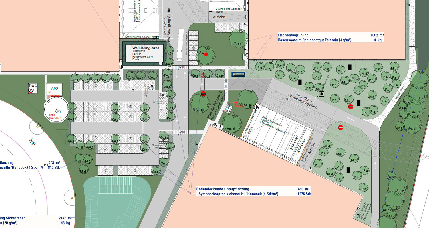 Im Weiteren erarbeiten wir z.B. für Gewerbeflächen qualifizierte Begrünungs- und Freiflächenpläne, die einen Fokus auf ökologische Aspekte haben und DGNB-zertifiziert sind.