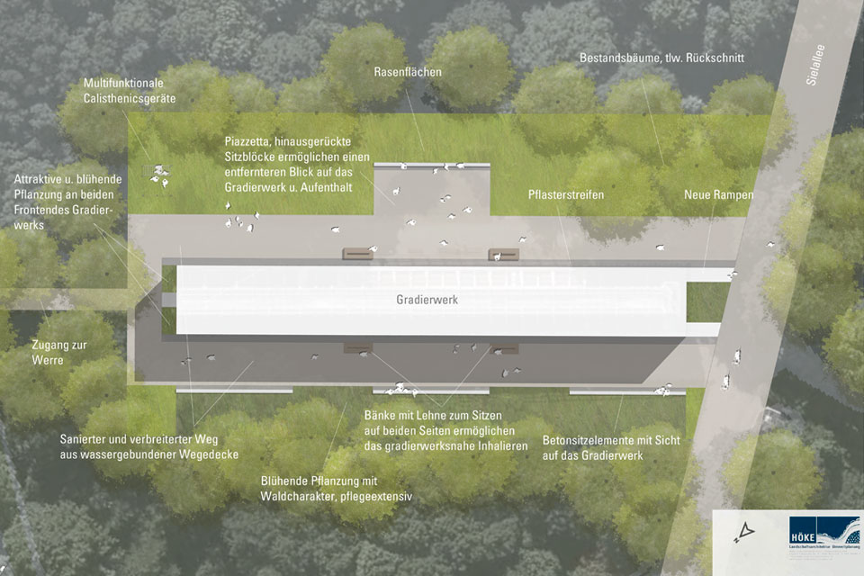Neben der Sanierung des Wegenetzes und der allgemeinen Steigerung der Aufenthaltsqualität liegt ein Fokus auf der Erlebbarkeit der Gewässer. An mehreren Stellen sind im Uferbereich der Teichanlagen Aufenthaltsbereiche z. B. in Form von Stahldecks und Uferterrassen vorgesehen. Im Weiteren werden Bereiche mit Spielangeboten für Familien auf den Wiesenflächen geschaffen. Das Umfeld des in der östlichen Parkzone liegenden Gradierwerks wird moderner attraktiver gestaltet. Nicht zuletzt gilt unsere Aufmerksamkeit der Flutmulde mit dem Reitplatz. Dort werden die Tribünen erneuert, die Möglichkeit zum Beachvolleyball wird geschaffen und an einem Hochpunkt des Werredeichs sind Sitzgelegenheiten mit Blick über die gesamte Werreaue vorgesehen.